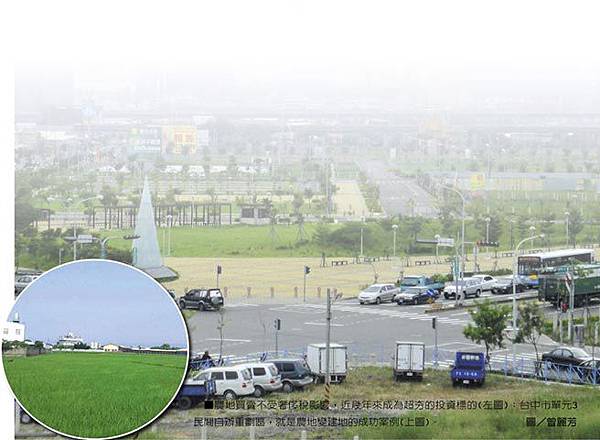 住商不動產中區協理賴萬表示,近幾年來,台中地價、房價持續高漲,帶動周邊農地的價格跟著上漲,而台中農地自辦重劃方興未艾。他說,台中市的後期發展區因靠近市區,例如單元1、2、3、4、8等民間自辦重劃區,都是農地變更為建地、帶動地價大翻轉的成功案例。