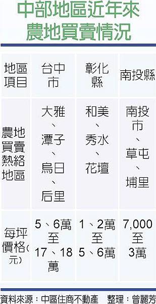 政府持續打房,住宅買氣明顯受到影響,部分資金流向不受奢侈稅限制的農地買賣,帶動中部地區包括台中市、彰化縣、南投縣等靠近市區周邊的農地,近兩年來買氣超夯,農地售價跟著水漲船高。